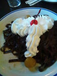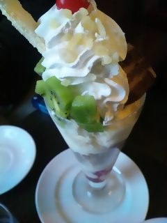 生クリームは慣れたとして。。この黄色の物体は栗。。。(栗はあまり好きではない@あたし)ココアパウダーがかかってます。最初のうちは分析しようかと思うのですが中盤からクリームは消失(時間と共にとける)し、しかも久々なのでど忘れしてコーヒー頼まないといけないのにソーダ水頼んでしまった....( ▽|||)サー(甘口*甘口になりますから)