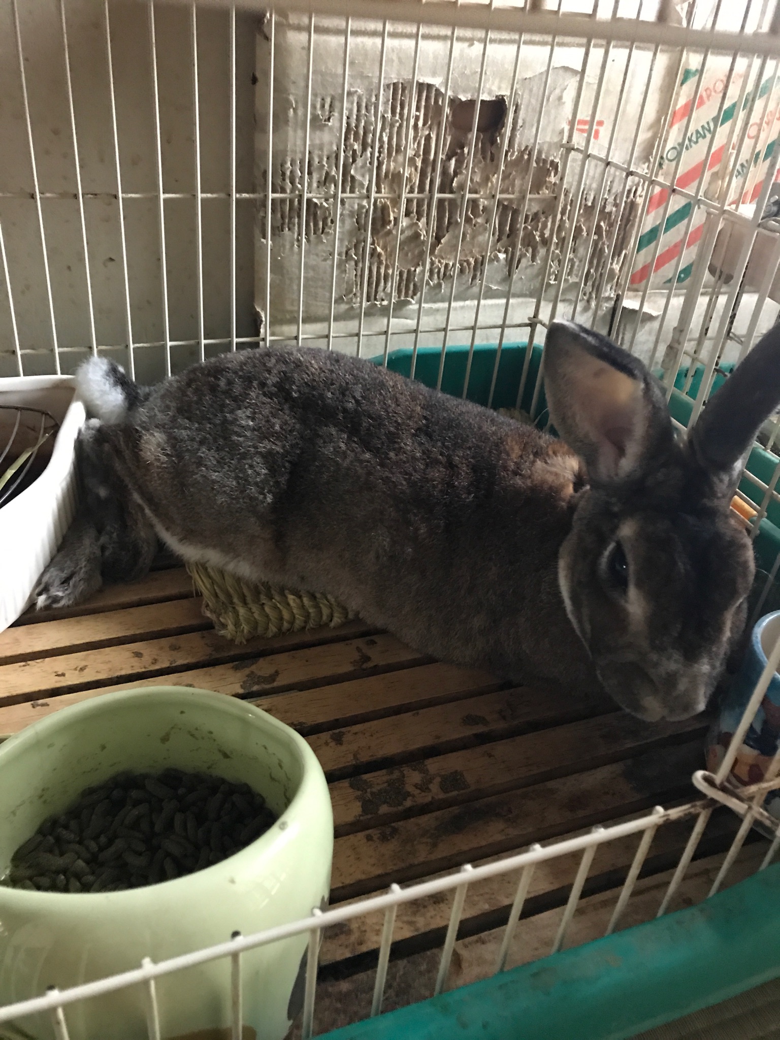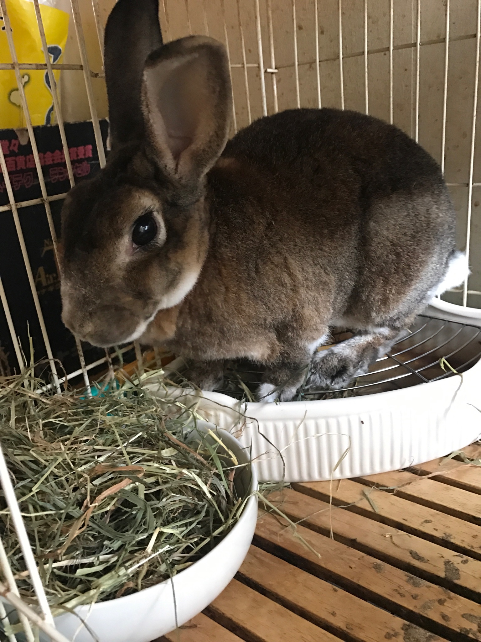 診察台ではうさぎの開き~状態になり「普段もこんな感じですか?」「ペレットの袋みると走りますけど」(盗み食いのテレパシーを先代から受けた?)